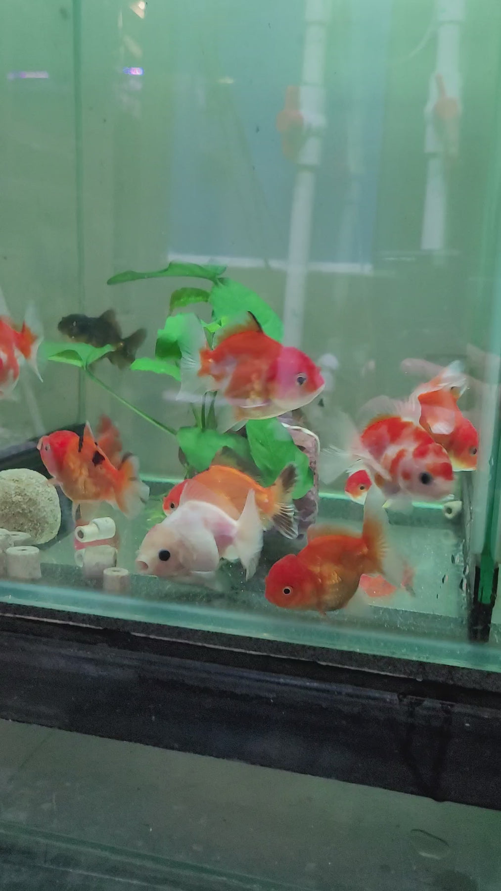 This species of fancy Goldfish has a huge variety in color: black, red, black with white dots, blue, black with grey gradient, red with orange-yellowish spots, white and many others.